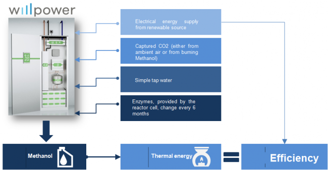 Das willpower energy® System ermöglicht uns allen, zukünftig unseren Kraftstoff zu Hause aus den Umgebungs-Ressourcen zu produzieren: dem CO2 aus der Umgebung, Wasser und erneuerbarem Strom. Das Kernsystem ist eine patentgeschützte elektro-biokatalytische Technologie zur Umwandlung von CO2 in erneuerbares Methanol. Das saubere und einfach zu handhabende, flüssige Methanol kann in Tanks gespeichert und für alle Arten von Heizungs-Anwendungen, zur Stromerzeugung oder zum Antrieb eines Methanol Kolbenhub-Motors oder einer Gasturbine verwendet werden. Das CO2 kann auch kontinuierlich aus den Verwendungs-Prozessen wieder zurückgewonnen werden (CO2-Direktrezyklierung).